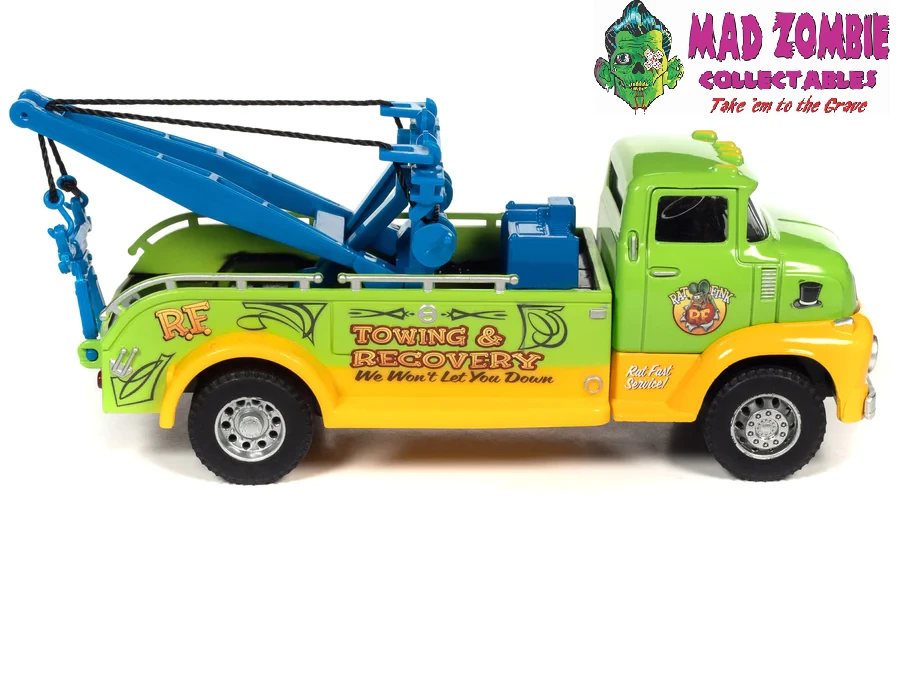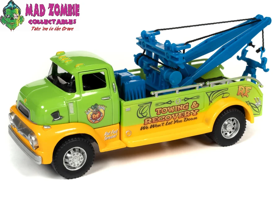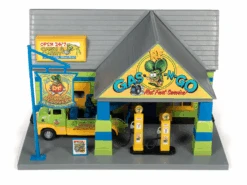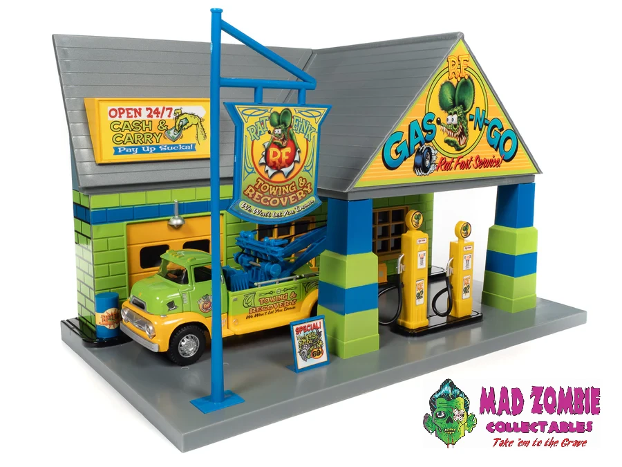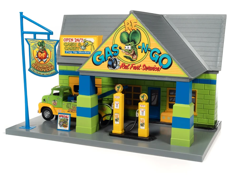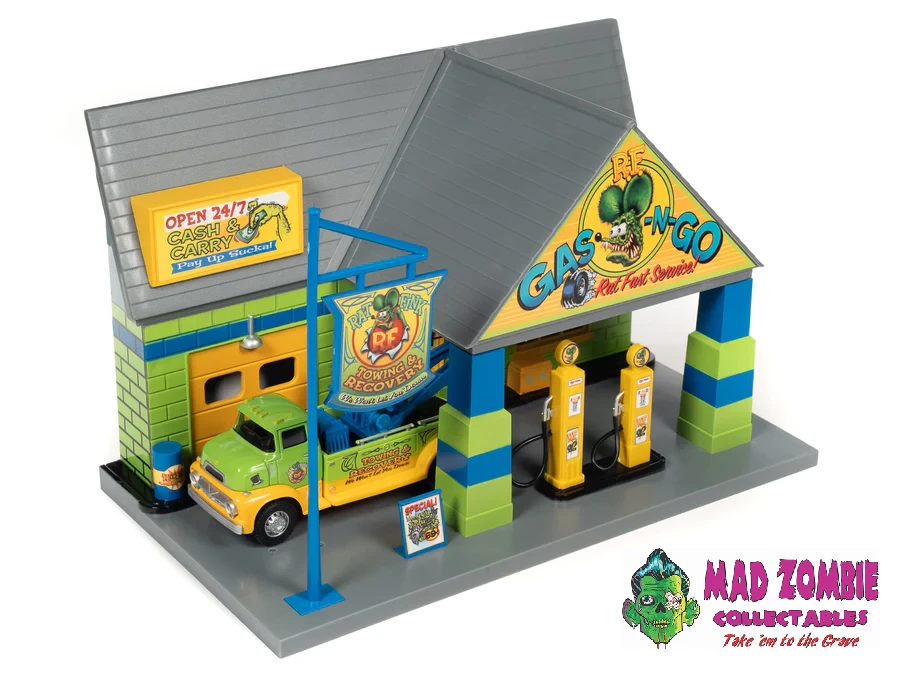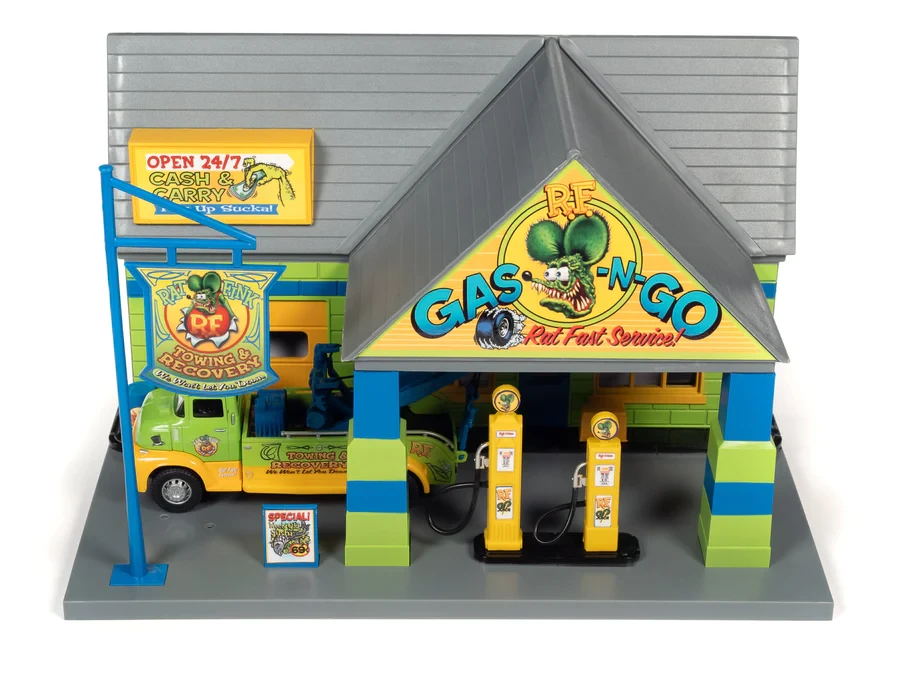 Open 24/7 it’s the R.F. Gas -N-Go Garage and Towing and Recovery Tow Truck. This 1:32 Garage and its companion tow truck is full off irreverent Rat Fink graphics. This Rat Fink garage façade has a drive through canopy with premium and regular gas pumps on the island. It’s sure to catch the eye of the Rat Fink collector looking to add to their finkish paraphernalia and all things Ed Roth. Delivers just in time for holiday festivities.