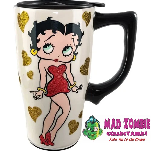 The Betty Boop 18 oz. Ceramic Travel Mug with Handle is a must have for fans. This mug holds up to 18 ounces of liquid and fits in most vehicle cup holders. Microwave and dishwasher safe.