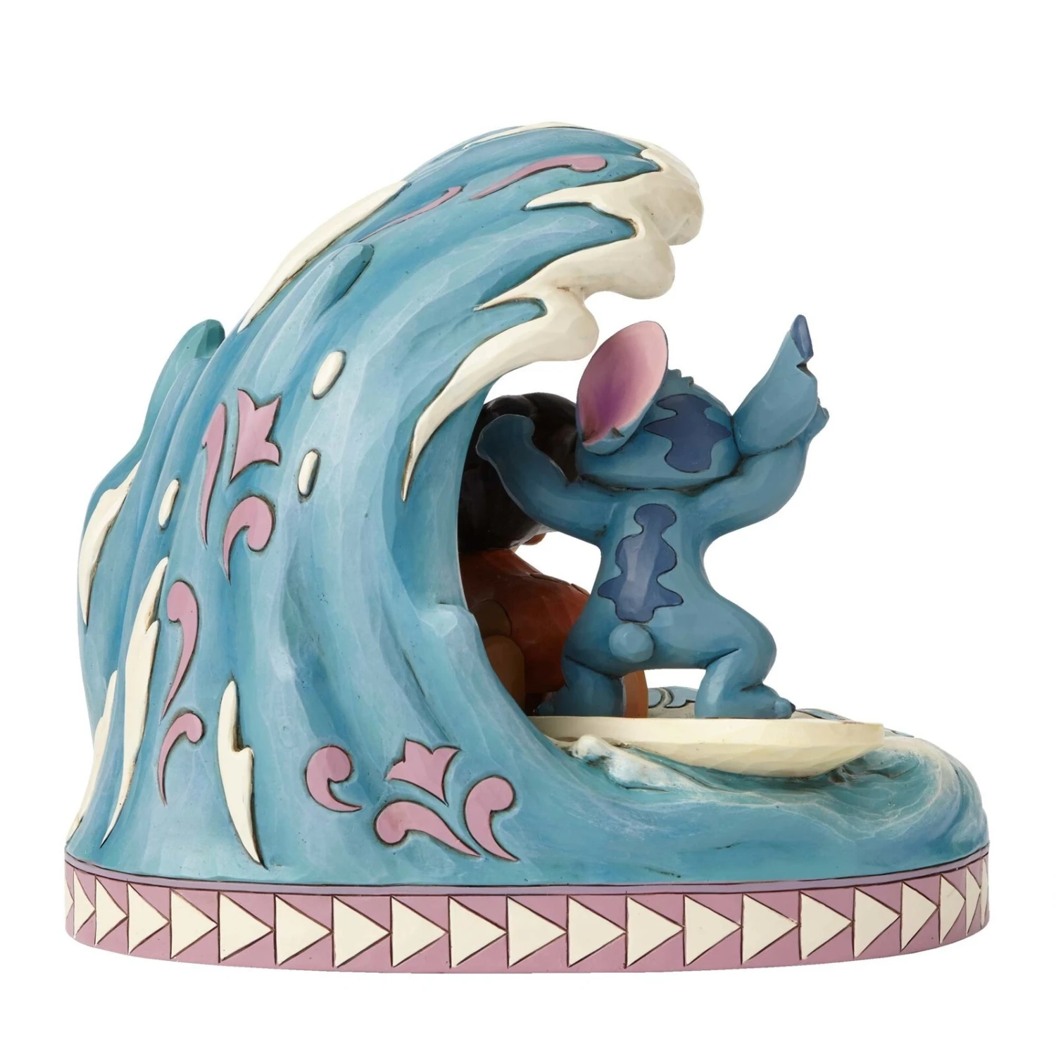 Jim Shore celebrates the 15th anniversary of the Disney classic Lilo and Stitch with this charming scene featuring the star crossed heroes hanging ten in the Hawaiian surf.