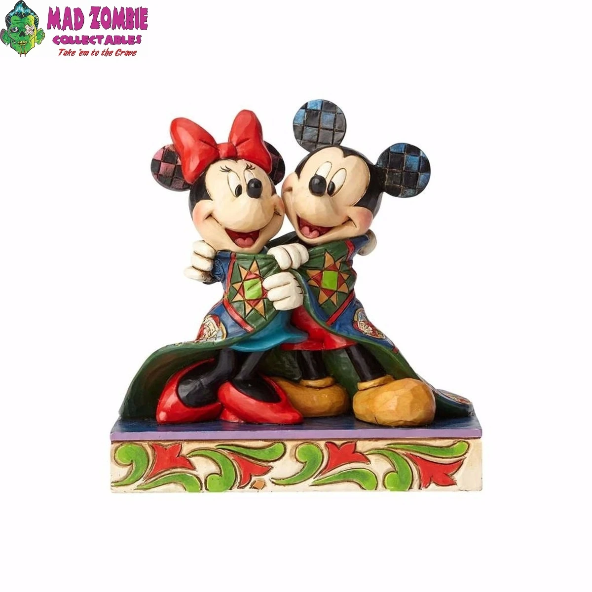 Huddled under a festive Jim Shore holiday quilt, Mickey Mouse and Minnie Mouse take a break from the busy holiday season. Designed by Jim Shore for Disney Traditions.