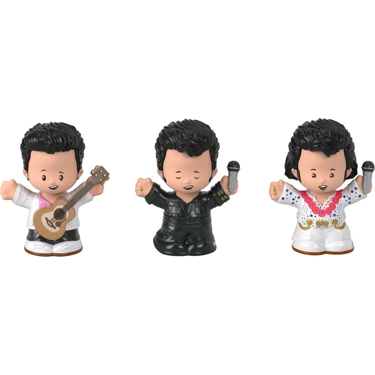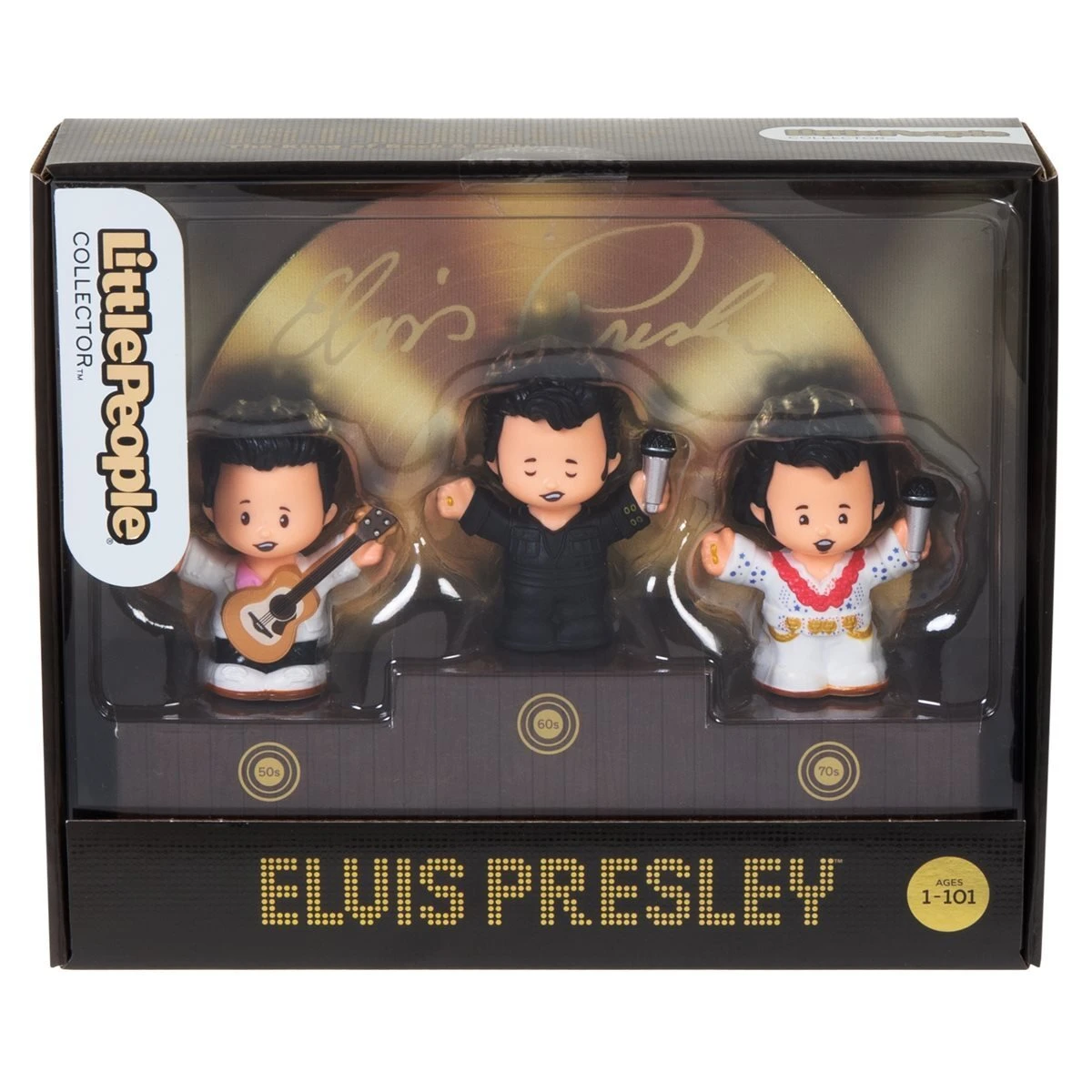 Music fans can rock and roll with Elvis throughout the decades with this Little People Collector Elvis Presley Figure Set from Fisher-Price! Measuring roughly 3-inches tall in classic Little People figure style, each figure in this set features a different look from each major era in Elvis’ storied career- the classic rock n’ roll look with guitar from the 1950’s, the all-black leather outfit from his 1968 Comeback Special, and the iconic jumpsuit he made famous in the 1970’s, complete with lei. This special edition set comes in a display-worthy window box featuring gold record graphics and the artist’s signature, making this a must-have item for music fans of all ages!
