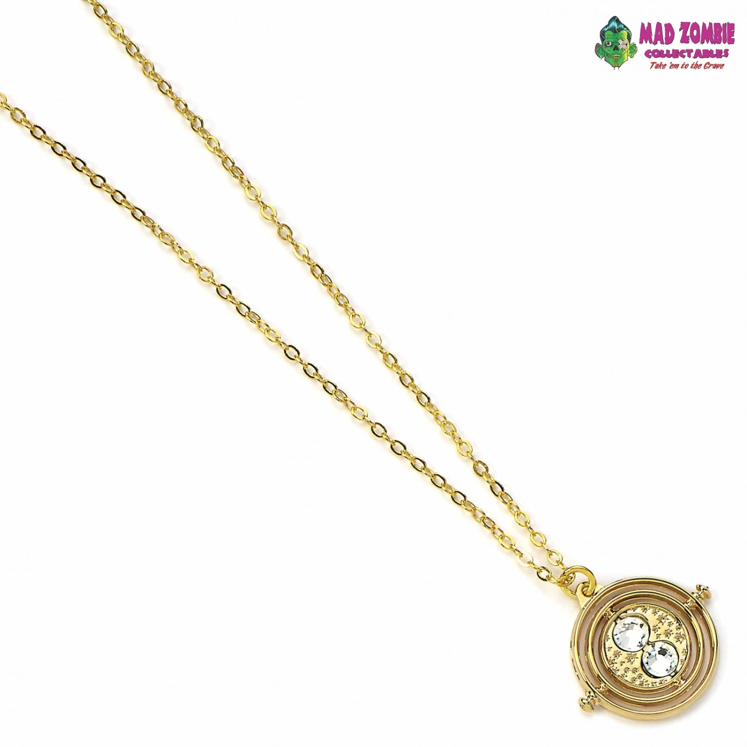 Official Harry Potter Fixed Time Turner Necklace Worn by Hermione Granger, the Time Turner played a huge part in the Prisoner of Azkaban The charm is approx 20mm in height and 20mm wide The Necklace is a gold plated link chain which is 40cm with a 5cm extender chain This necklace comes on the official Harry Potter branded card packaging and shows the Warner Bros logo on the reverse The Carat Shop are the official licensed manufacturers of Harry Potter Jewellery on behalf of Warner Bros. Please be aware that this design does not rotate