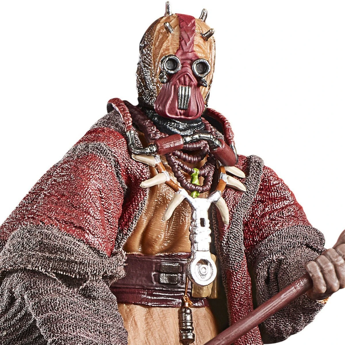 The leader of a tribe of Tusken Raiders, the Tusken Chieftain captures Boba Fett after his escape from the Sarlacc in the Great Pit of Carkoon in the series The Book of Boba Fett. He comes armed with a special gaffi stick and is adorned with unique markings setting him apart from the rest of his clan. Ages 4 and up.