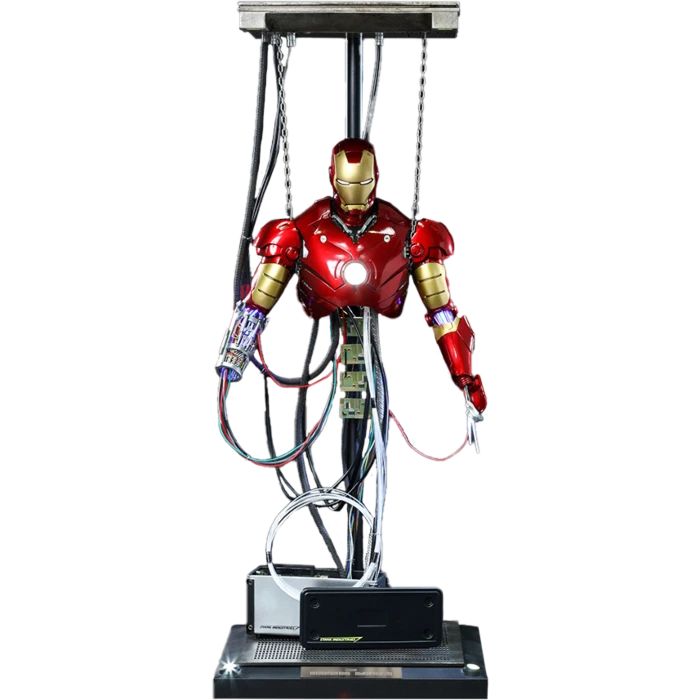 Can’t get enough Iron Man? Well take a look at this partially constructed Mark III, with exposed wiring and repulsors this Hot Toy would go great with a Tony Stark Hot Toy in his workshop! Held up like a car engine in his workshop, Tony Stark calibrates and adjusts his Iron Man suit.