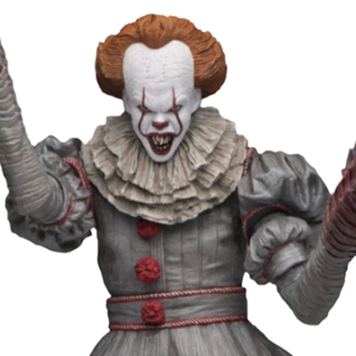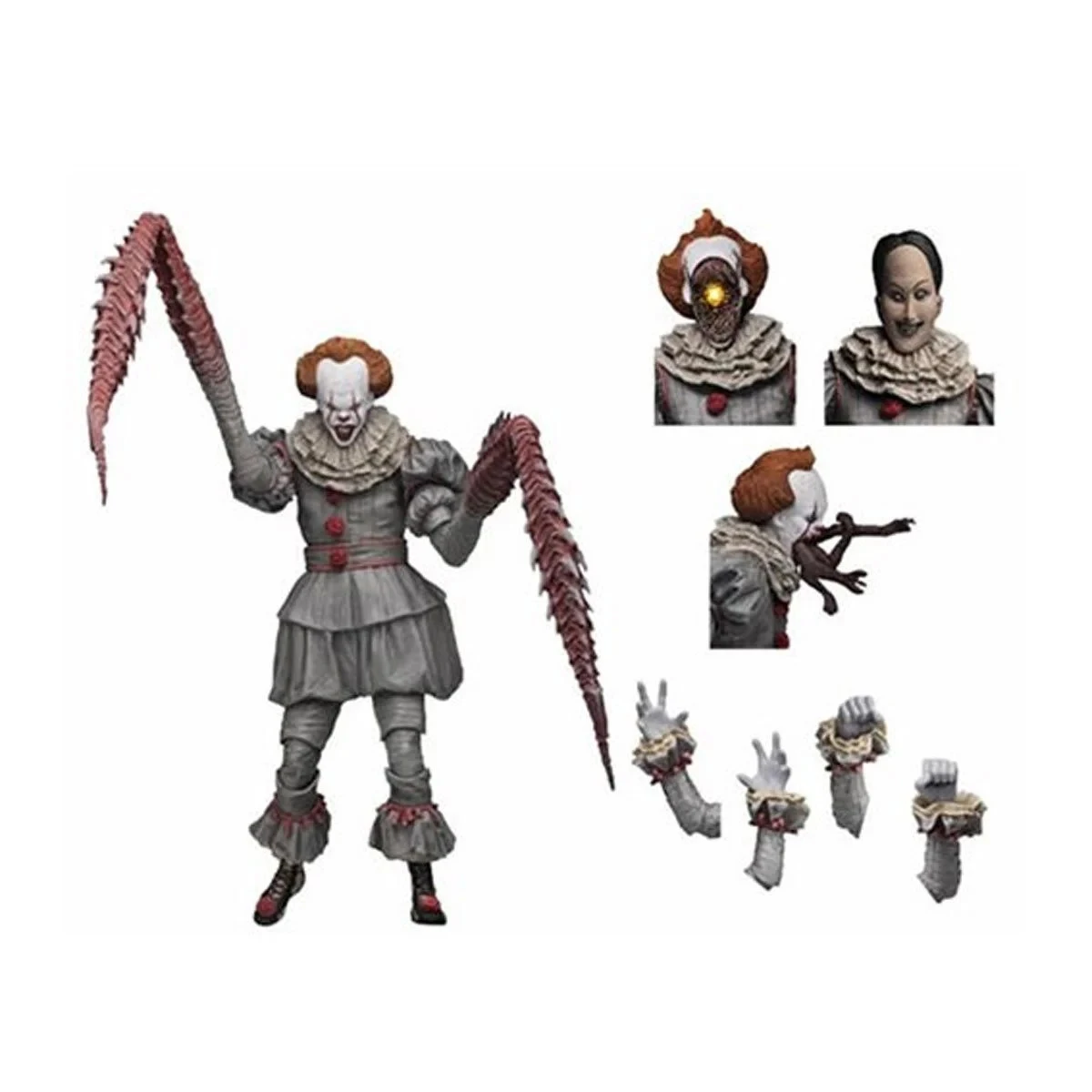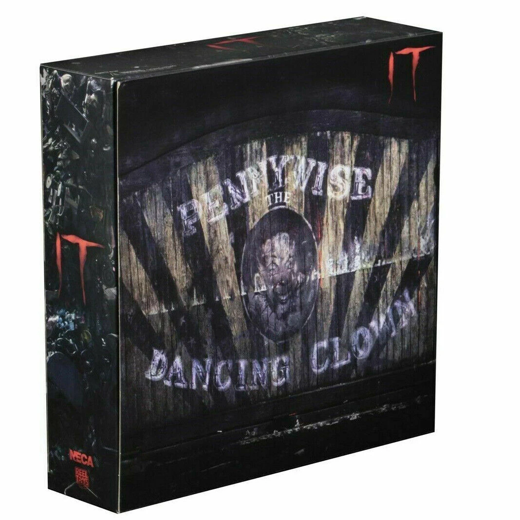 From the acclaimed 2017 horror film It, drawn from the pages of Stephen King’s original novel, NECA presents Pennywise: The Dancing Clown! Based on Bill Skarsgard’s portrayal of the nightmare-inducing clown, this 7-inch scale figure has been painstakingly detailed to be as accurate to Pennywise’s ornate costume as possible, and is presented in an Ultimate format with special packaging and LED lights inside one of the heads. This version features 4x head sculpts, 3x of which are all updated heads: “Judith” painting Head, emerging arms head, and light-pp “deadlights” head with LED light inside the mouth. The figure also includes interchangeable articulated insect arms, interchangeable forearms, and 2x pairs of hands. The special window box packaging has a fold down flap in homage to the Dancing Clown scene from the film. Uses button cell batteries, which come included. Ages 17 and up.