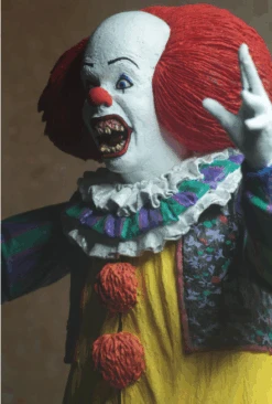 Based on Tim Curry’s portrayal of the terrifying clown, this 7″ scale figure is faithful to his on-screen appearance and packed with detail and accessories. Pennywise is fully articulated and features a total of three all new interchangeable heads, plus interchangeable hands (including a massive monster hand), “Turn Back Now” balloon and 3-D “emerging hand” book.