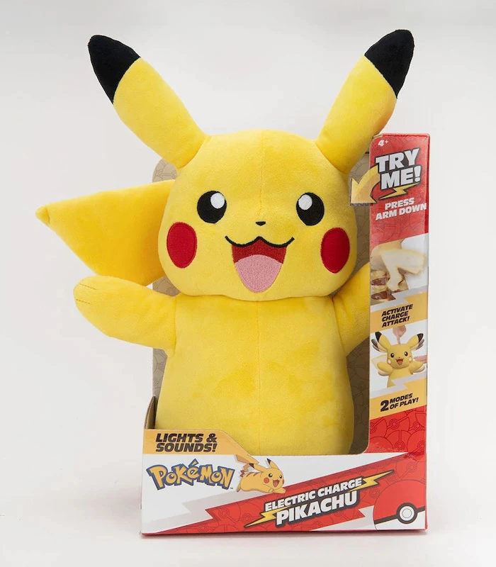 Piiii-kaaaa-CHUUU!!!! Get ready for an electrifying Pokémon experience with Electric Charge Pikachu! This incredible 11” plush is the ultimate Pikachu training experience with lights, sounds, and awesome movement features! With over 20 authentic sounds and over 30 unique reactions, this Pikachu plush brings the iconic character to life like never before. Pikachu brings the thunder with awesome features, but pokémon fans of all ages will enjoy cuddling up next to this plush’s super-soft material. Pet or rub Pikachu’s head to bond with Pikachu or press on Pikachu’s belly to experience conversational reactions. Pressing and holding on Pikachu’s head will cause Pikachu to ready an attack. The longer you hold, the more powerful Pikachu’s attack becomes! Release Pikachu’s head and watch Pikachu react with sounds, movement, and light features in the cheeks and tail! Gotta Catch ‘Em All!™ An Officially licensed Pokémon Product from Jazwares! Suitable for ages 4 years and up.